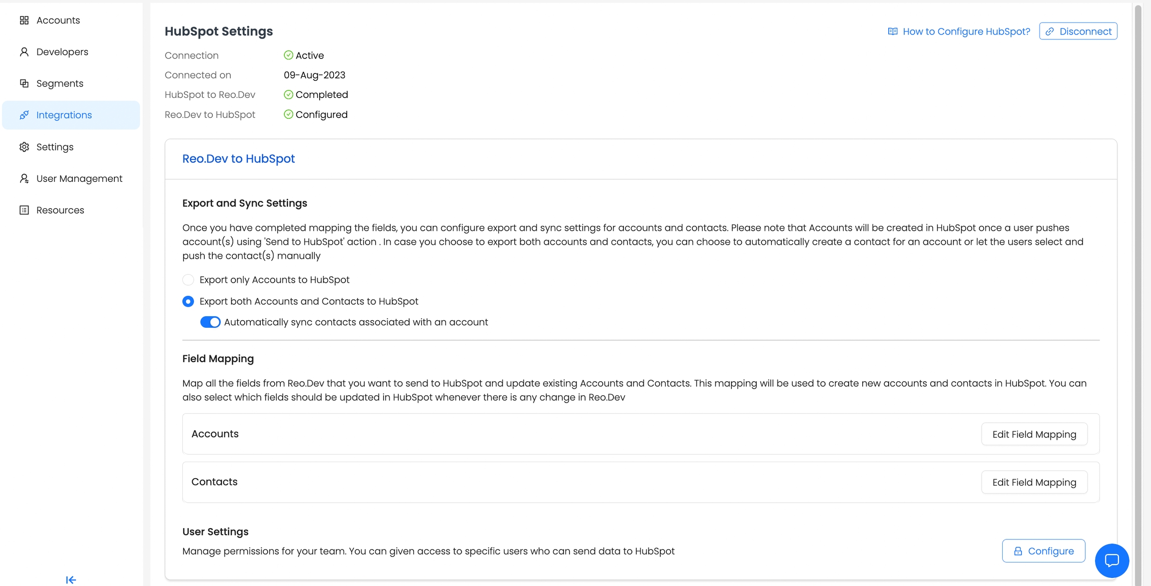 You can select Accounts and Contacts if you want to only export accounts from Reo.Dev to HubSpot. Under Accounts and Contacts, you have an option to sync contacts associated with an account automatically or manually. If you select manually, the users will have need to select contacts from the developers tab for each accounts and click on Send to HubSpot.