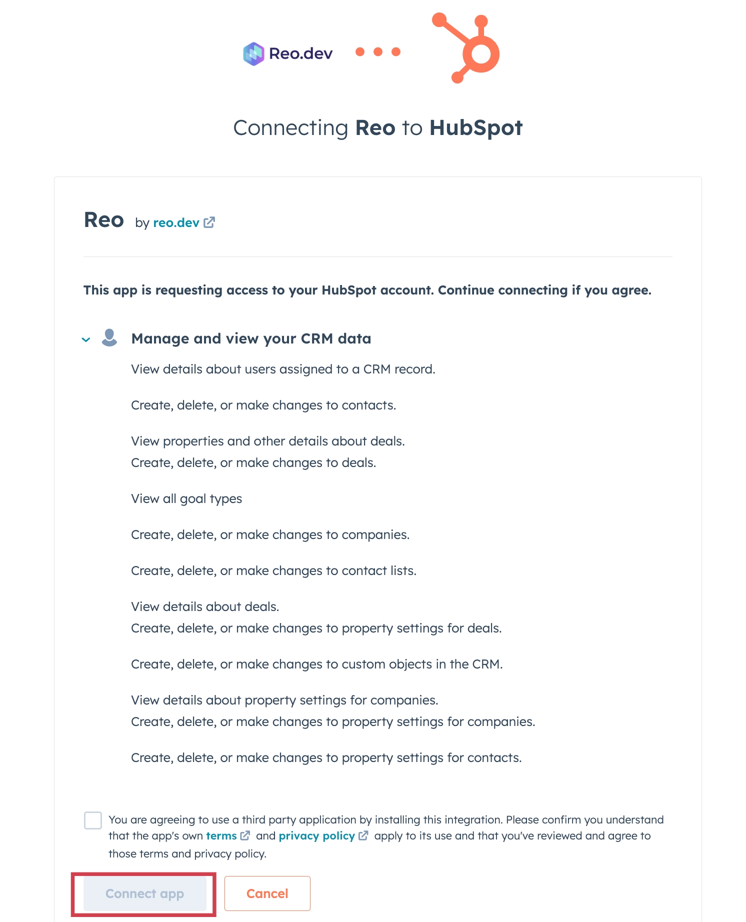 Note: Reo.Dev will request access to read and write contacts and companies and read and edit contact and company properties.