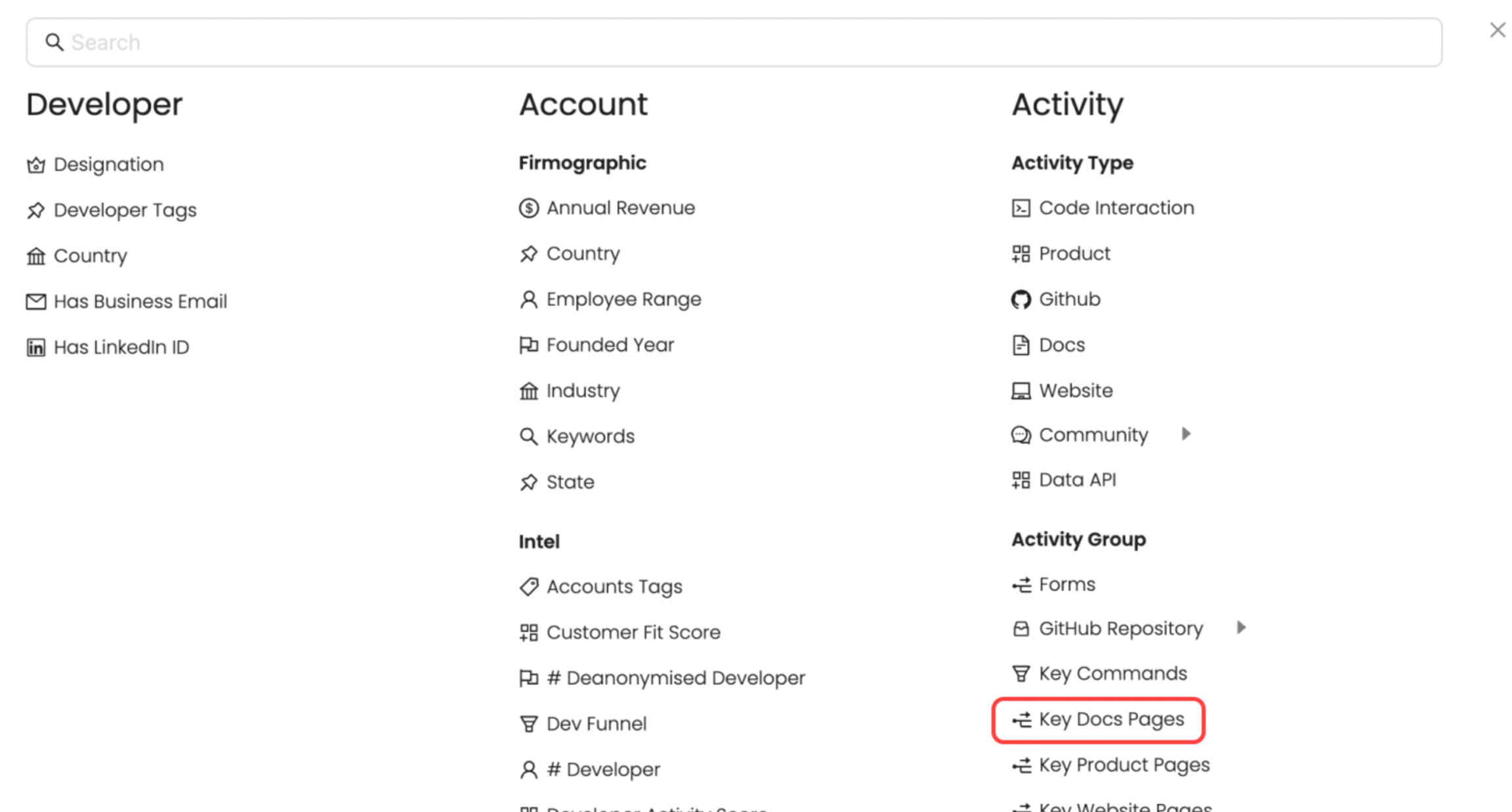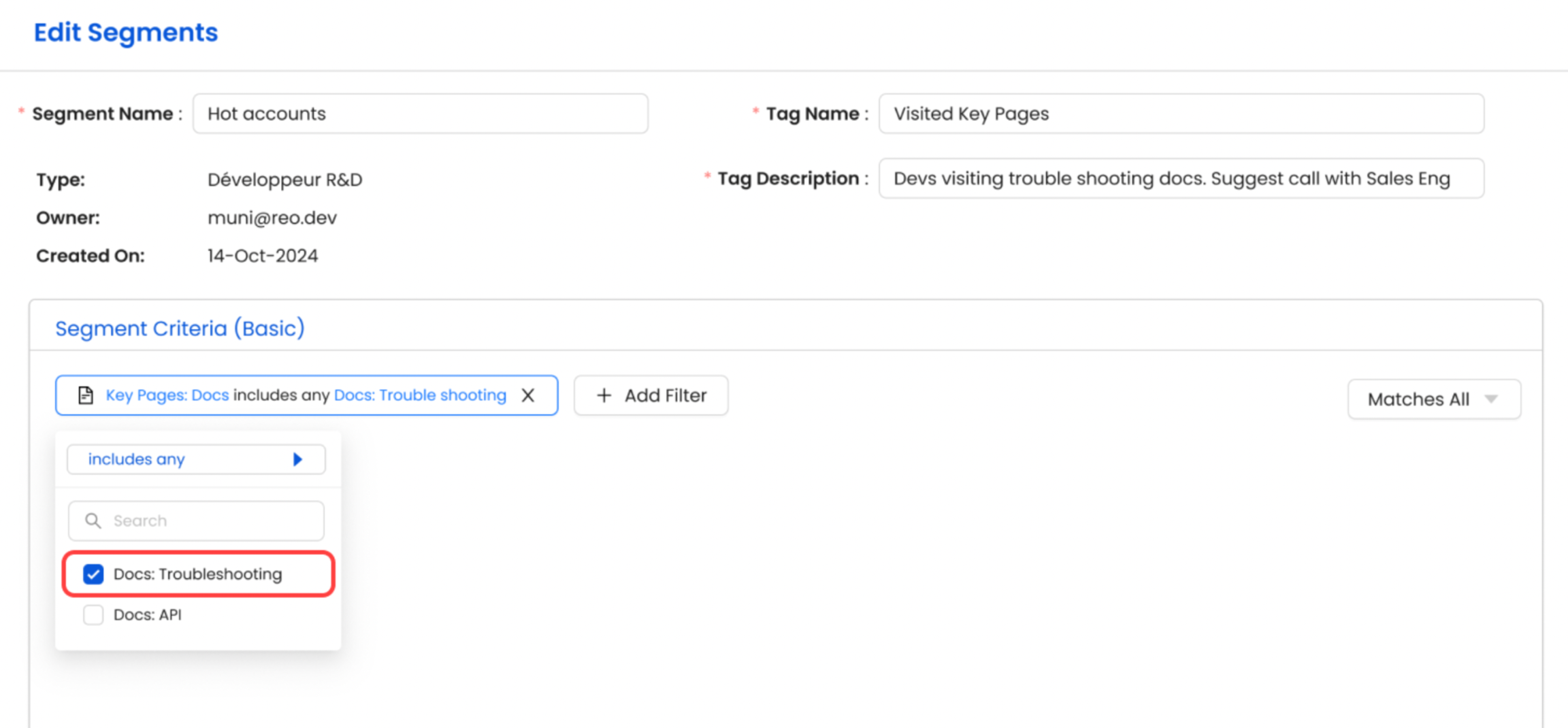 Once added, you can create a Segment to see accounts or developers interacting with each documentation site. The title will appear under the ‘Key Docs’ filter when creating segments.