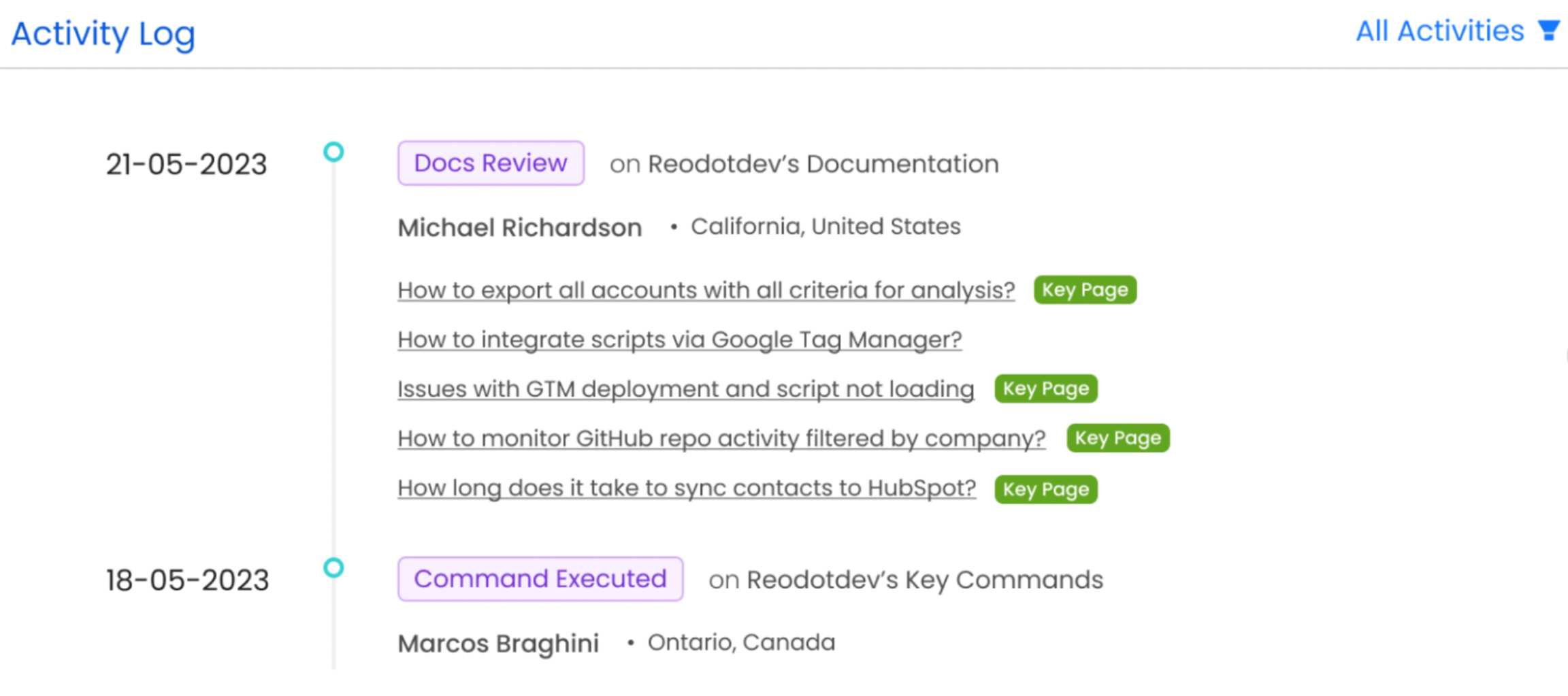 Here, you can see which developers have visited your Key Pages, how many times they've engaged, and whether they've read or copied content from the documentation—valuable insights that can serve as hooks in your messaging.
