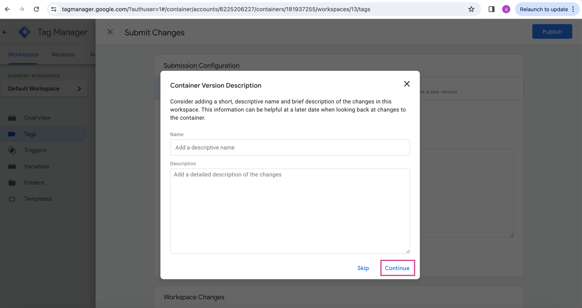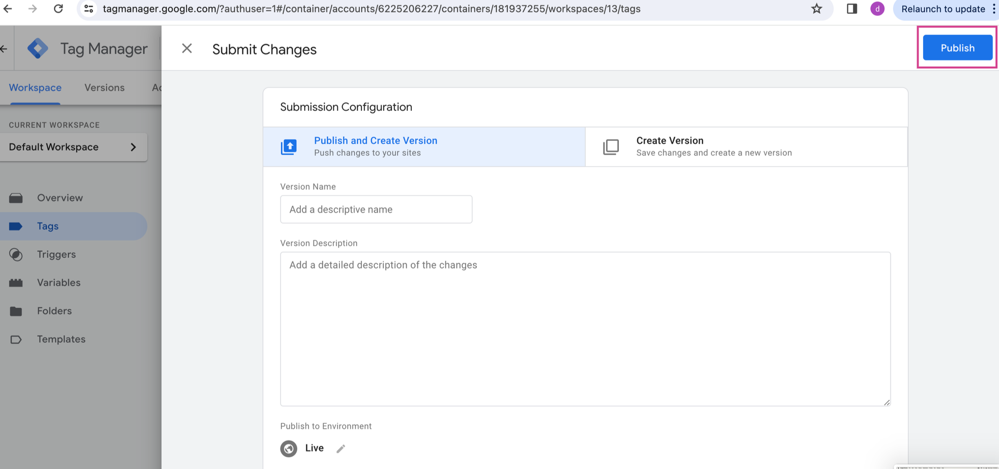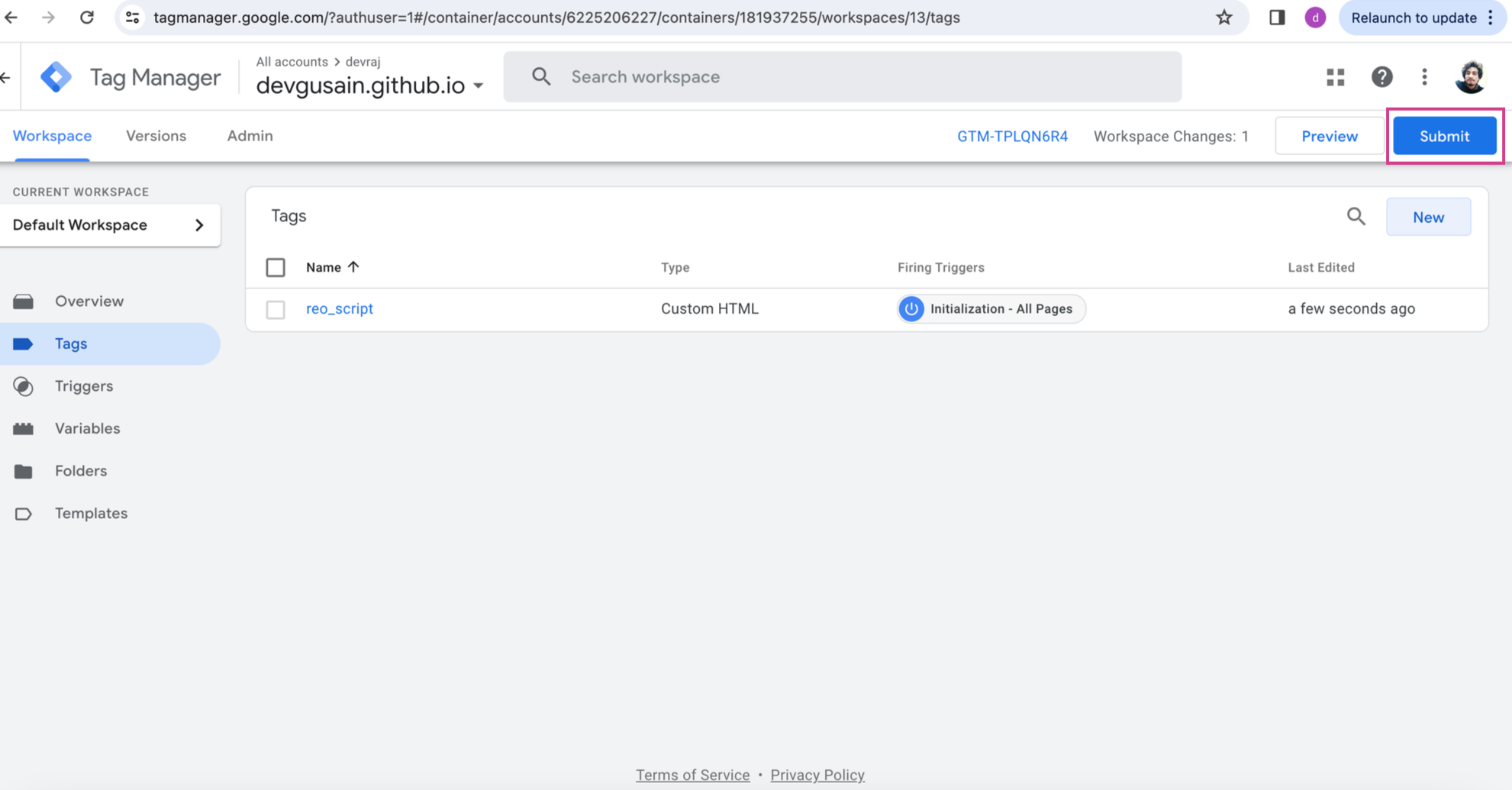 Step 9: On saving the tag , you will land on tags page. Then click on Submit button to proceed for publishing your changes.