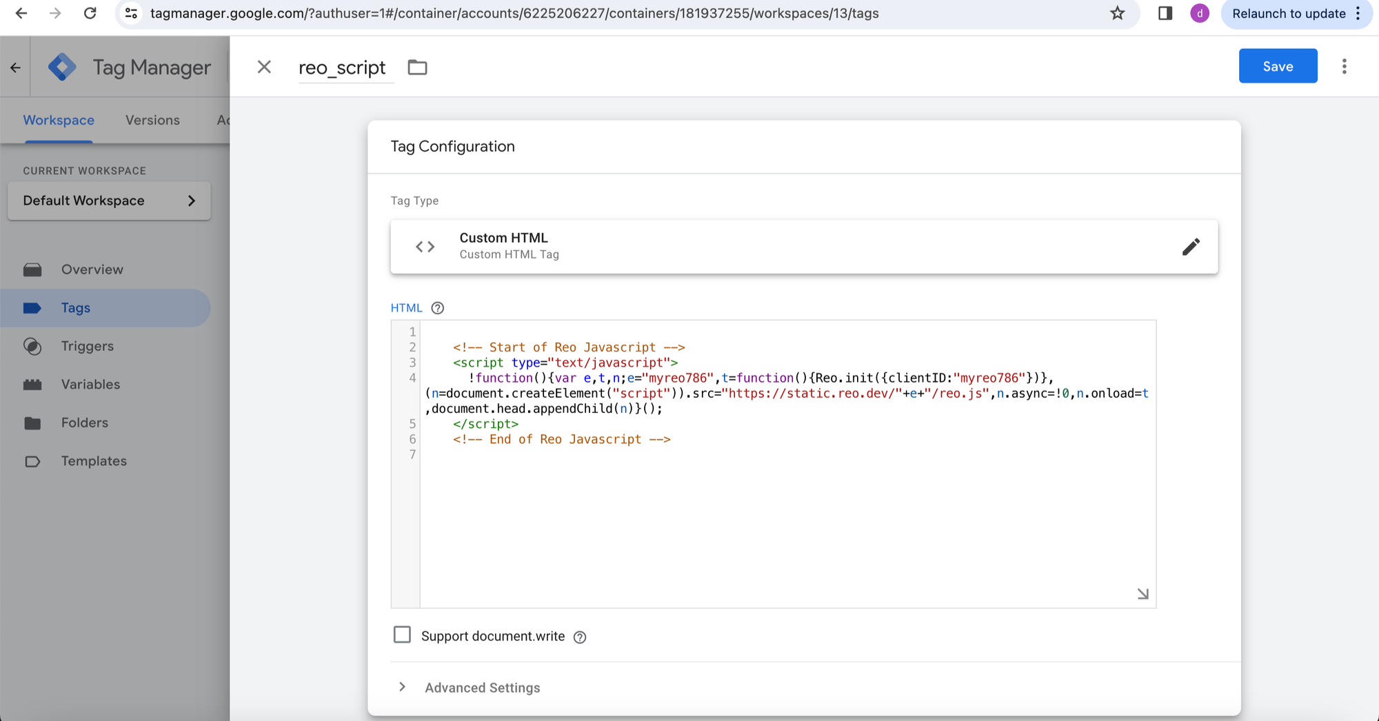 Once the Base URL is set up, you can proceed with adding the tracking script in GTM.