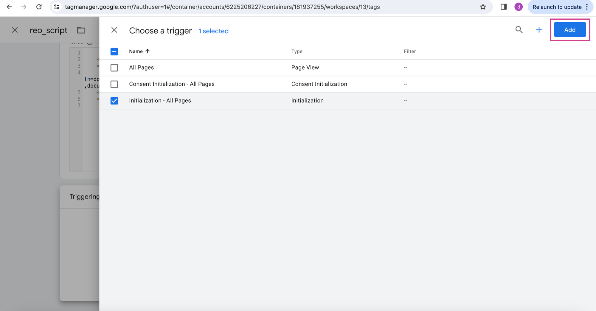 Step 7: After that, choose a trigger for the script to load. After choosing trigger (Initialization -All pages) , click on button.