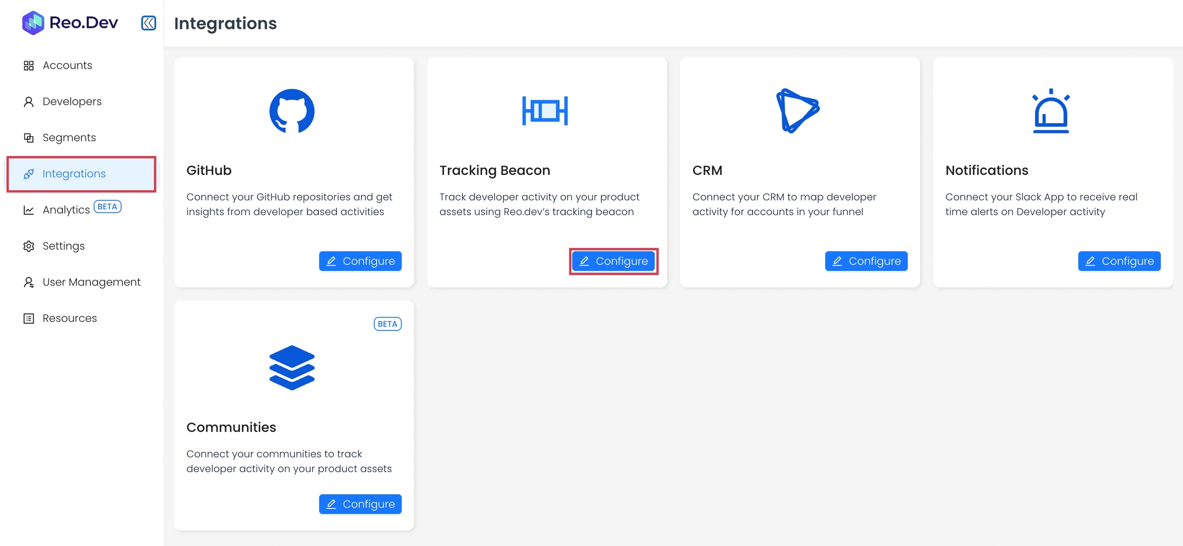 Step 1: Click on Integrations → Configure on Tracking Beacon card