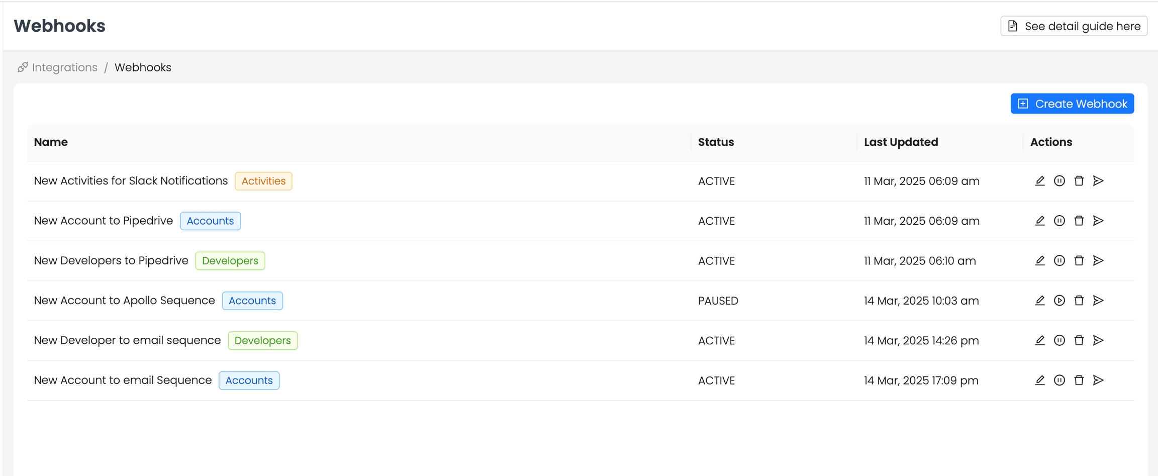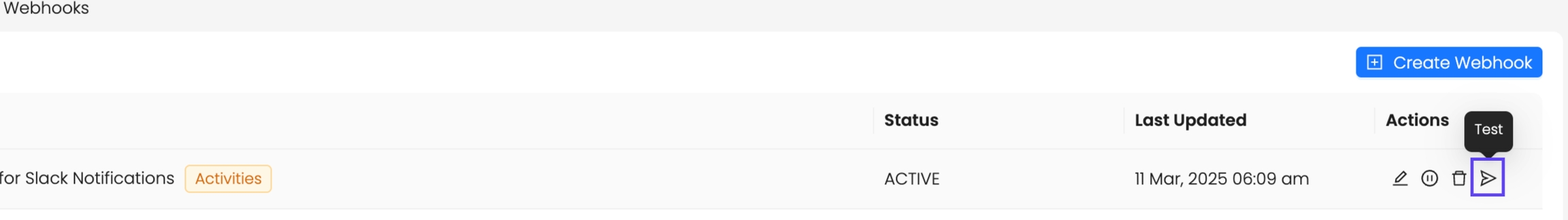 You will see the Webhooks dashboard listing all created webhooks, their status, and last updated activity time.