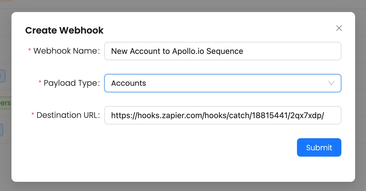 .Destination URL → Enter the external system’s API endpoint (e.g., a Zapier webhook URL).