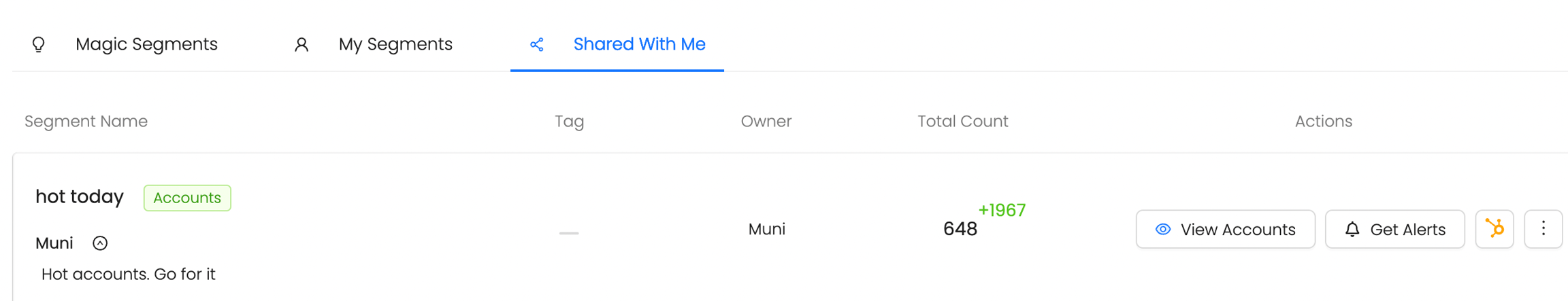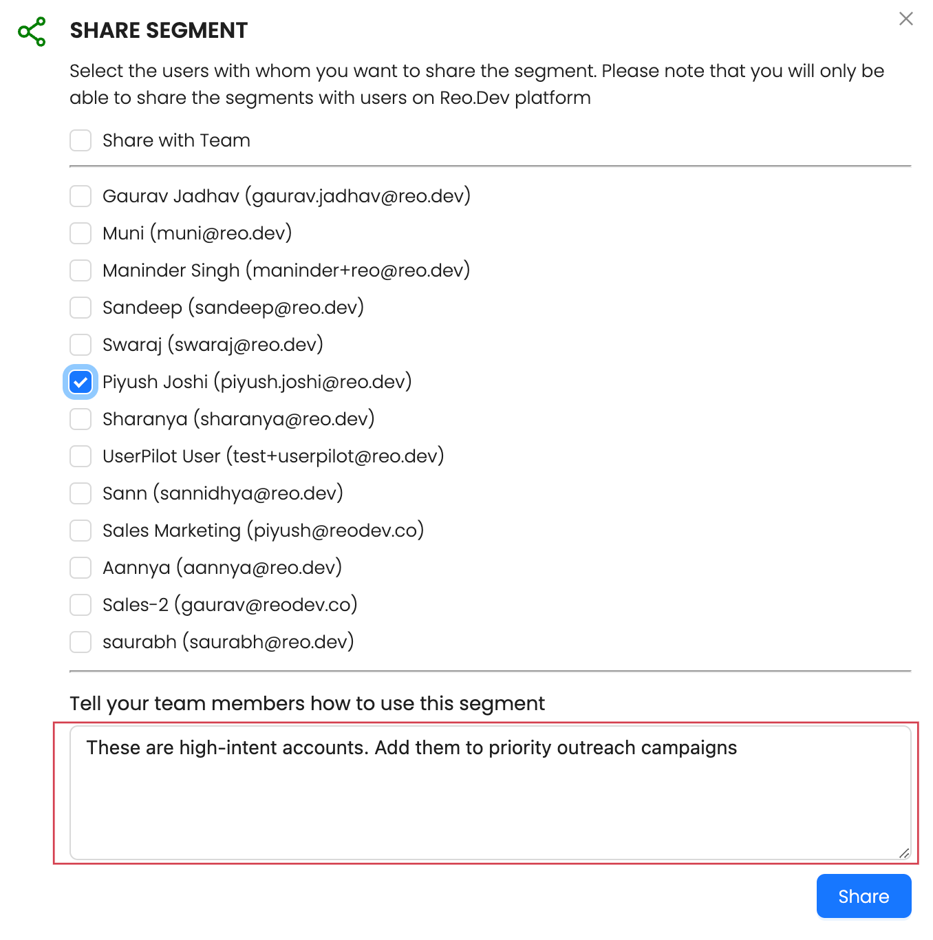 Reo.Dev Notes help users clearly communicate the reasons behind sharing a segment. Without this context, team members may struggle to understand the significance of a shared account or lead.