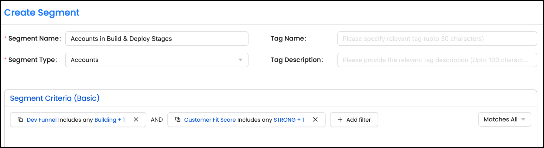 Matches All (AND): This operator combines all the filters, and a record must meet every filter condition to be included in the segment.