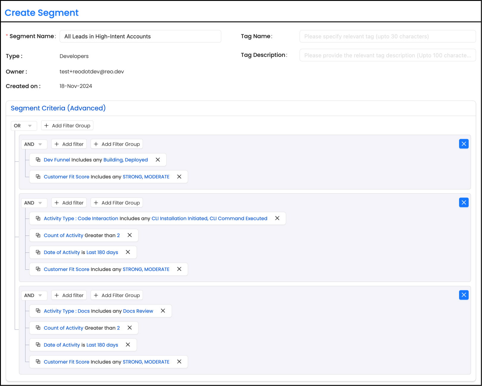 Use Case: This advanced segment is perfect for casting a wide net to include high-fit developer leads from accounts showing strong intent signals. By combining multiple filter groups with AND within each filter group and OR across all the filter groups, you maximize your lead pool while ensuring all included developers meet meaningful engagement thresholds.