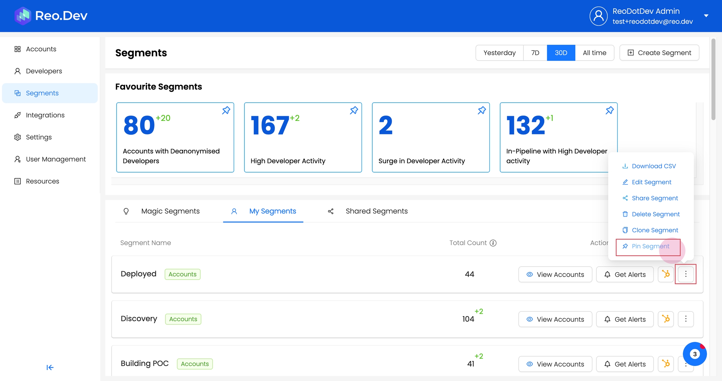 Step 1: Click on the burger menu corresponding to the segment of interest. Select Pin Segment from the dropdown menu.