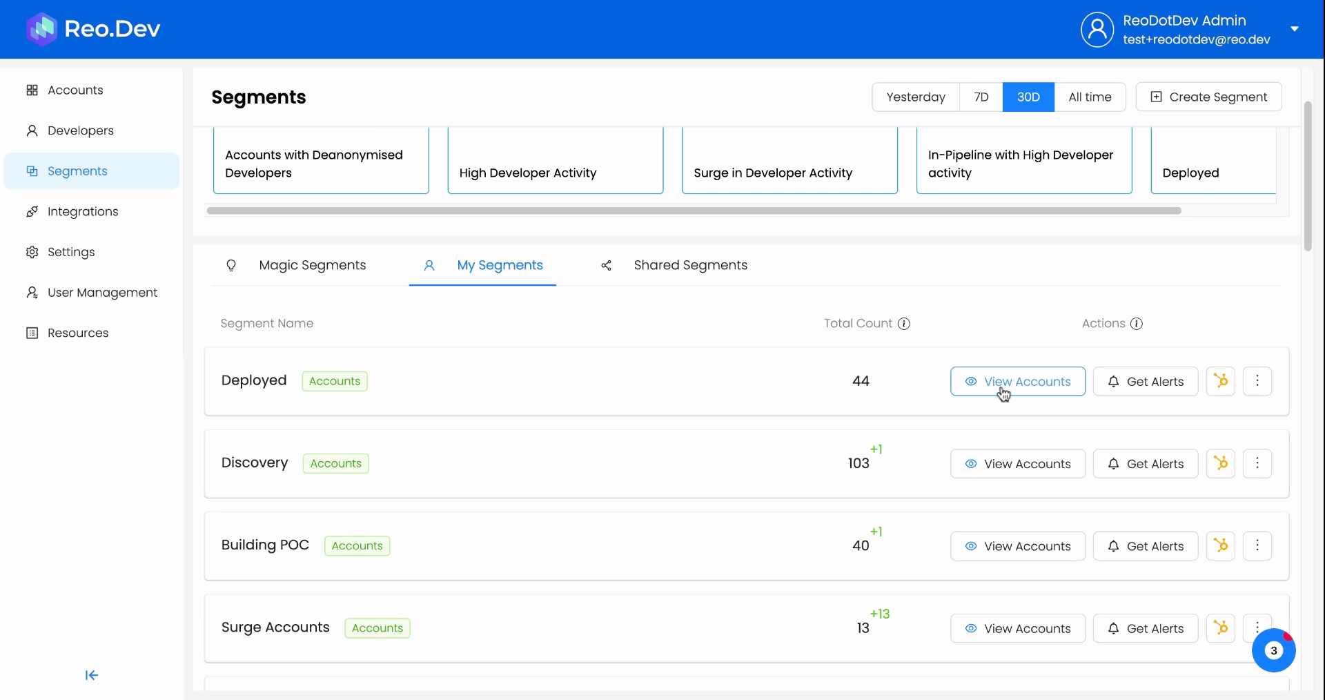 My Segments displays a list of all user-created segments. Each time a new segment is created, it is automatically added to this section for easy access and organization.